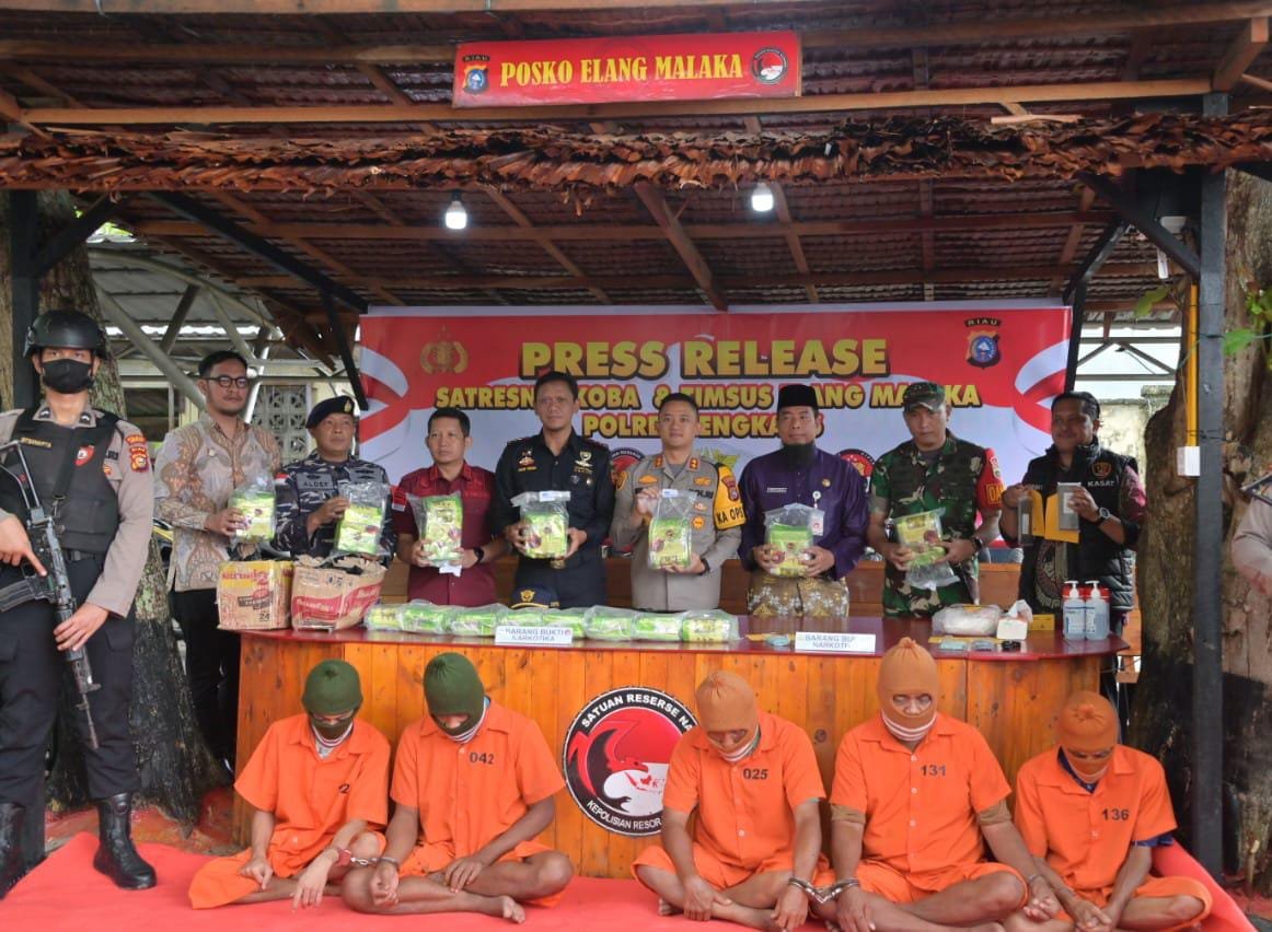 HL BENGKALIS – Team gabungan Satnarkoba Polres Bengkalis bersama Bea Cukai Bengkalis melakukan penyelidikan dan meringkus empat tersangka penyalahgunaan narkotika dengan barang bukti 15.729,85 Gram, peran empat tersangka sebagai kurir.