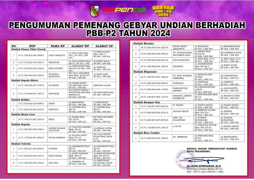 HL PEKANBARU – Badan Pendapatan Daerah (Bapenda) Kota Pekanbaru, mengumumkan pemenang gebyar undian berhadiah Pajak Bumi dan Bangunan Perdesaan dan Perkotaan (PBB-P2) tahun 2024.