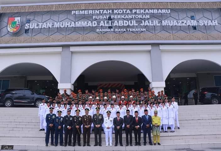 HL PEKANBARU – Penjabat (Pj) Wali Kota Pekanbaru Risnandar Mahiwa bersyukur upacara HUT ke-79 Kemerdekaan Republik Indonesia (RI) berjalan sempurna di lapangan Gedung Utama Kompleks Perkantoran Wali Kota Tenayan Raya, Sabtu (17/8/2024). Upacara bendera kali ini mengukir sejarah baru bagi Risnandar sebagai Pj Wali Kota Pekanbaru.