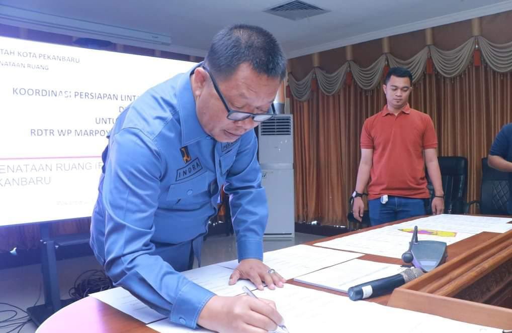 HL PEKANBARU – Sekretaris Daerah Kota (Sekdako) Pekanbaru Indra Pomi Nasution menandatanganani Lampiran Peta Rencana dan Tabel Ketentuan Kegiatan dan Penggunaan Lahan dalam Rancangan Peraturan Kepala Daerah tentang Rencana Detail Tata Ruang (RDTR) untuk wilayah perencanaan Kecamatan Marpoyan Damai. Penandatanganan ini digelar di ruang rapat lantai 5, Gedung Utama Kompleks Perkantoran Tenayan Raya, Kamis (17/10/2024).