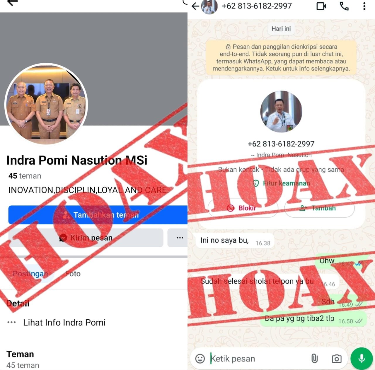 “Saya tegaskan itu bukan akun Facebook dan Akun whatsaap saya, saya hanya mempunyai satu akun Facebook satu, yang nama akunnya, Indra Pomi, dan jarang saya gunakan, begitu juga dengan akun whatsaap, semoga kawan – kawan selalu waspada terhadap penipuan yang mengatasnamakan diri saya maupun pejabat yang lain. Itu Hoax,”tegas Indra.