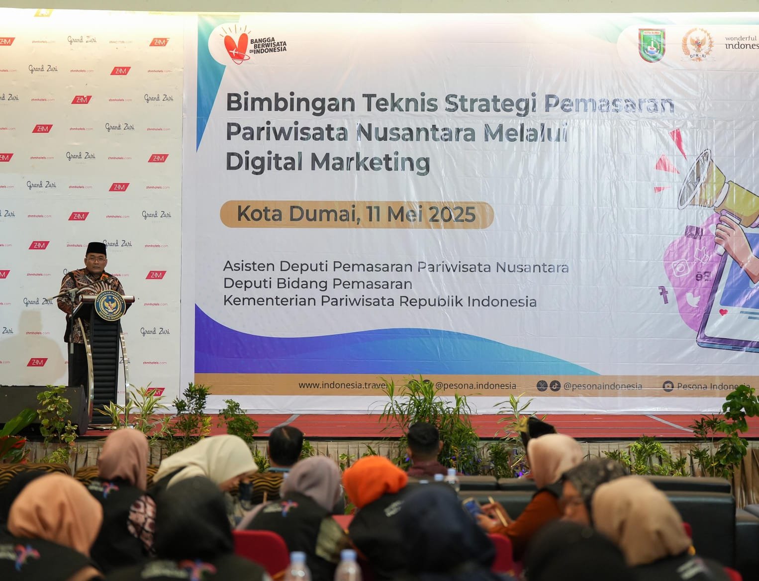 Dukungan ini ditunjukkan melalui Bimtek Strategi Pemasaran Pariwisata yang menyasar kepada para pemangku kebijakan serta pelaku pariwisata di Kota Dumai dengan total 75 orang peserta dengan fokus pada penguatan pemasaran berbasis sektor digital.