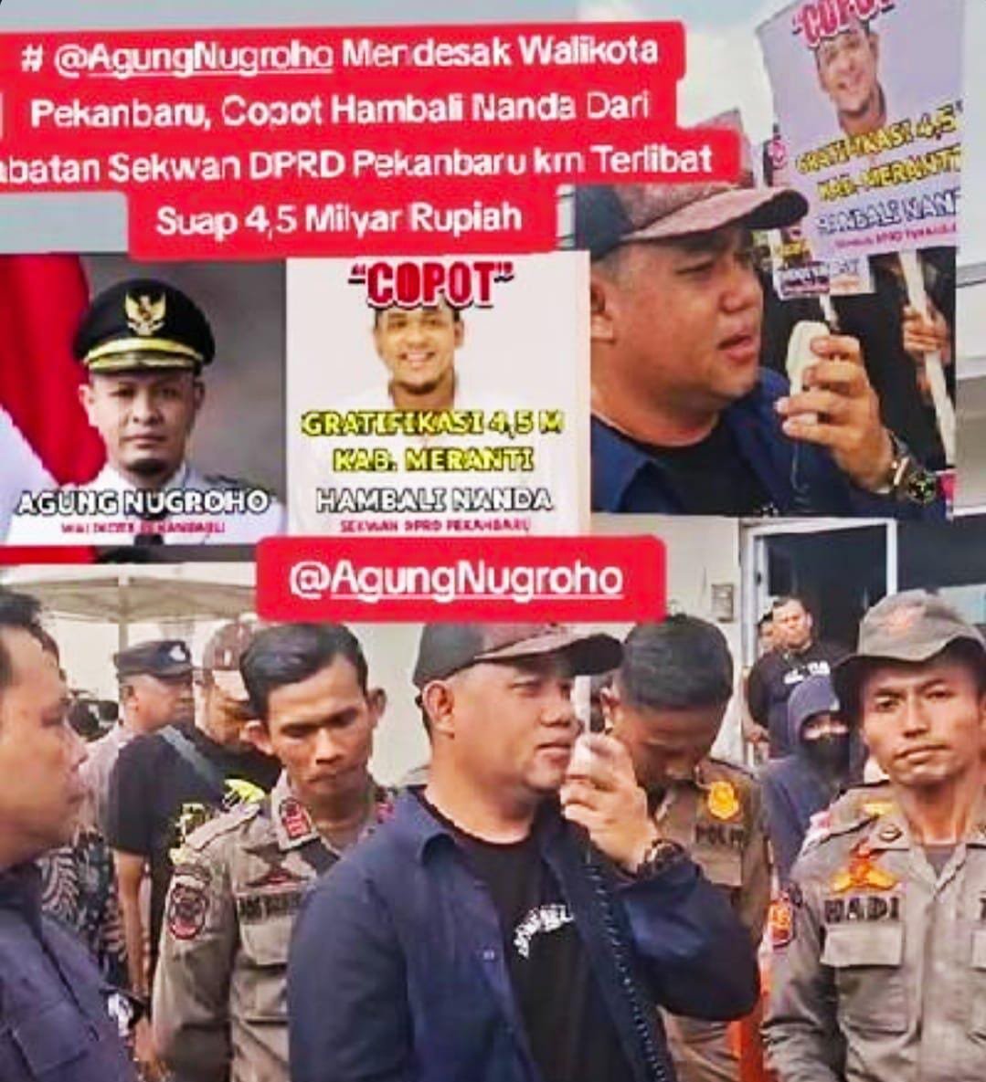 HL PEKANBARU – Aliansi Gerakan Mahasiswa dan Masyarakat Peduli Riau (GEMMPAR) menggelar aksi unjuk rasa di Pekanbaru untuk mendesak Wali Kota Agung Nugroho segera mencopot Hambali Nanda dari jabatannya sebagai Sekretaris DPRD Pekanbaru. Hambali diduga terlibat dalam kasus suap sebesar Rp4,5 miliar yang terungkap dalam proses konferensi.