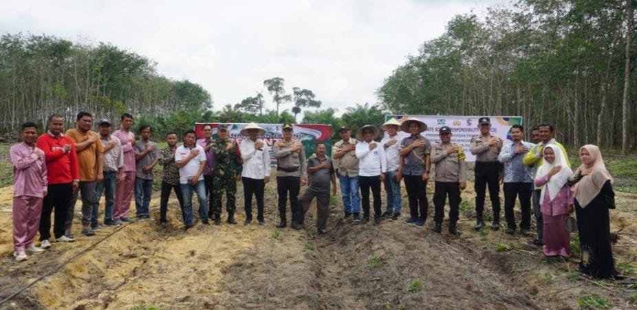 Penanaman jagung seluas 1 hektare dilakukan di titik koordinat +0.033348, +102.027975 dengan melibatkan berbagai pihak terkait, termasuk unsur Forkopimcam, perwakilan perusahaan, dan masyarakat setempat.