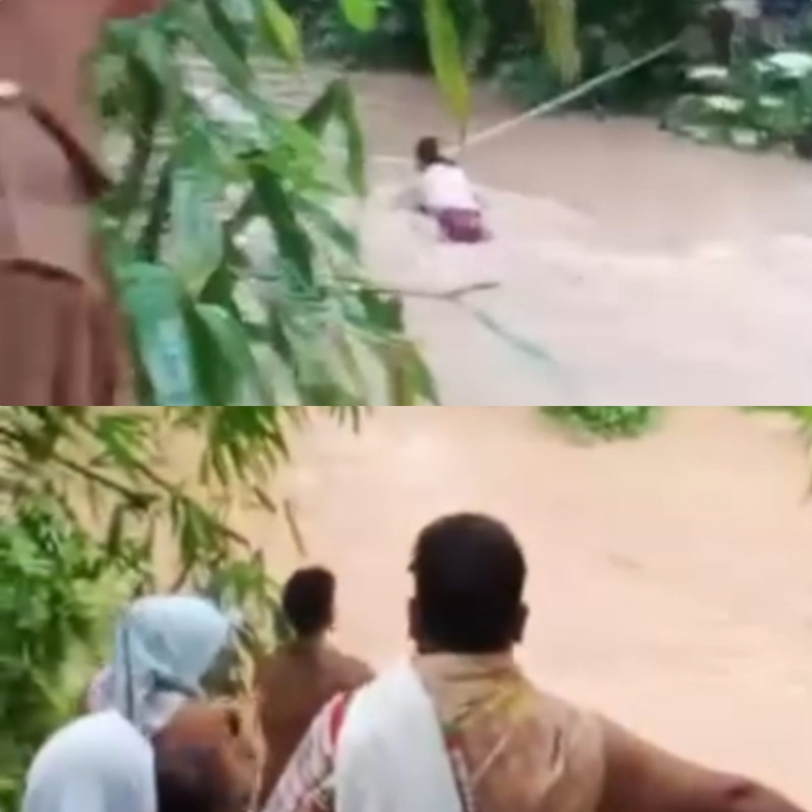 arus sungai hanya dengan cara berpegangan pada seutas tali saja.