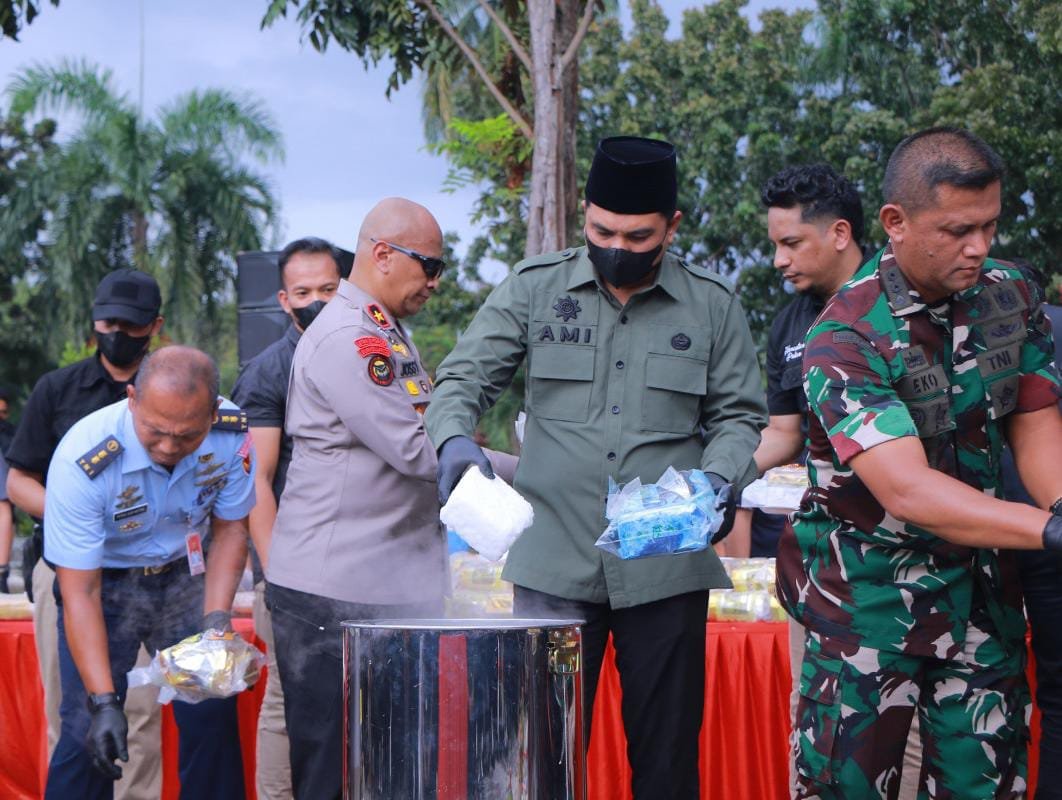 HL PEKANBARU – Polda Riau laksanakan pemusnahan barang bukti berupa 118 kilogram sabu, 131 ribu butir ekstasi, 15 kilogram ganja, 16.015 ribu botol minuman keras, 15 liter tuak dan 1.030 knalpot brong.